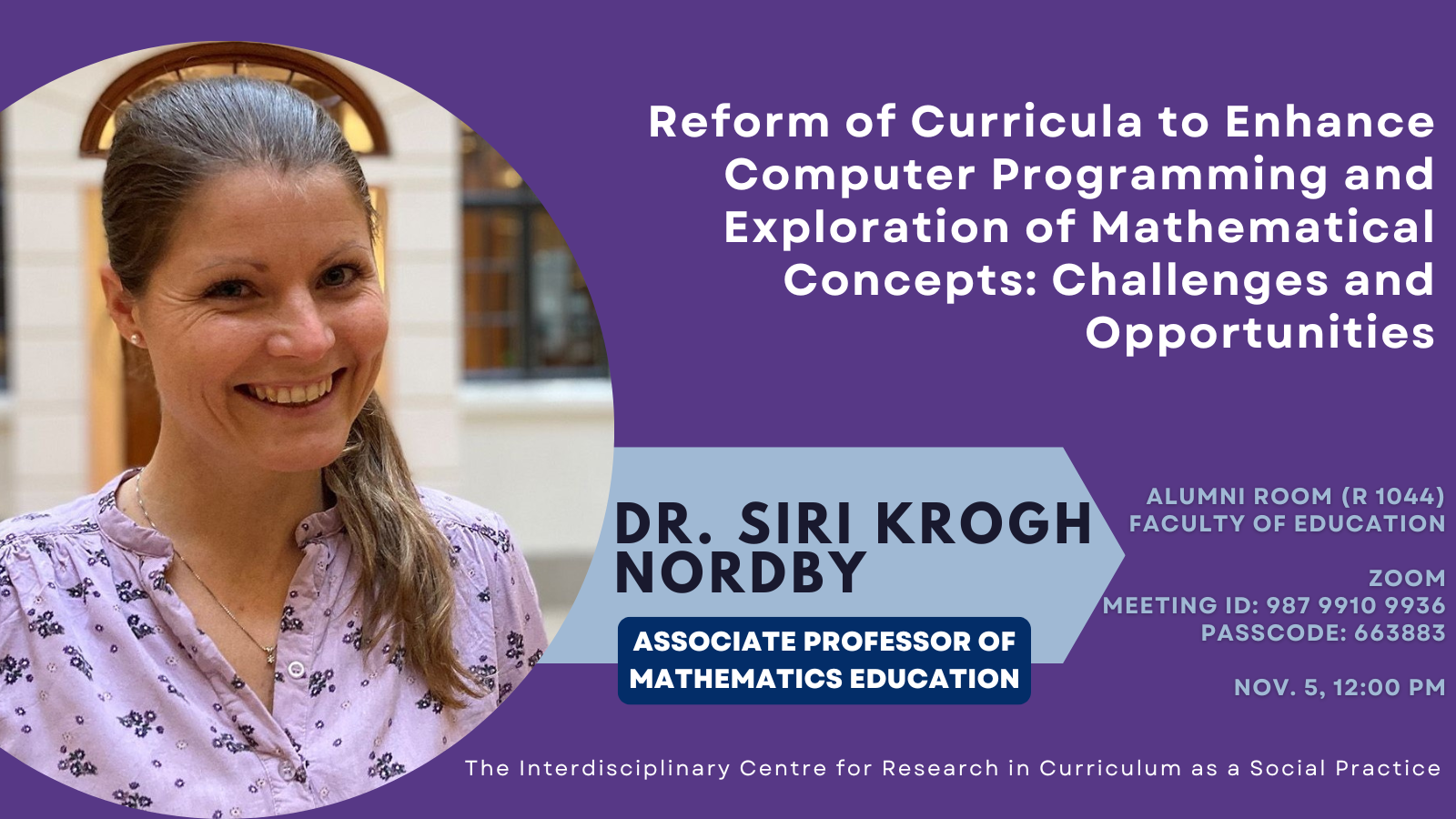 In this talk, Dr. Nordby will invite you to consider how computer programming is integrated into mathematics curricula, and how it can serve as a tool to support students’ exploration of mathematical concepts. Since the early 2000s, computer programming has sparked significant interest and debate within the research community. With its inclusion in curricula in both Norway and Canada, we see that computer programming brings both challenges and opportunities. Through examples and hands-on activities, Dr. Nordby will invite you to explore how computer programming can be used as a thinking tool in mathematics education to deepen students’ understanding of mathematical ideas.